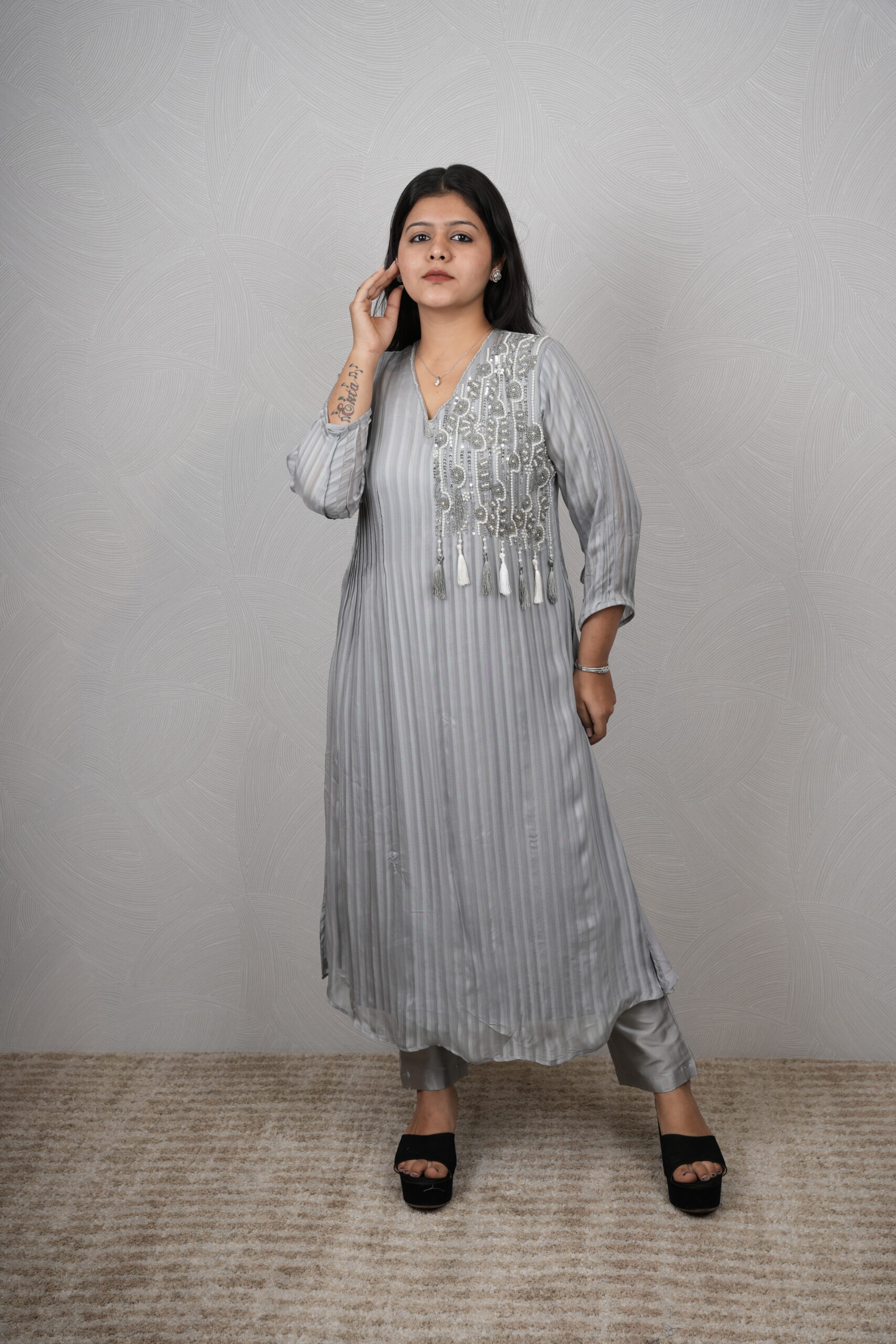 Sophisticated grey kurta set with delicate floral sequence work . Perfect blend of modern minimalism and traditional design. For all the products, the standard size is S,M,L,&XL