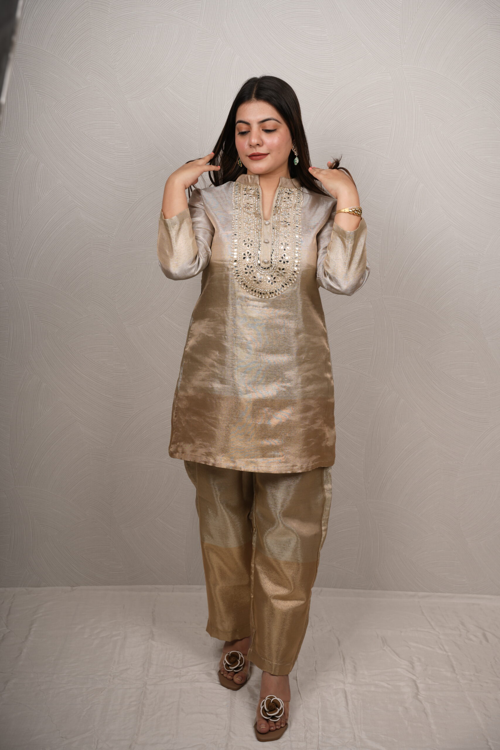 Elegant , classy , timeless Beautiful tissue fabric with intricate hand cord detailing on the neckline- giving you that subtle festive glow..
