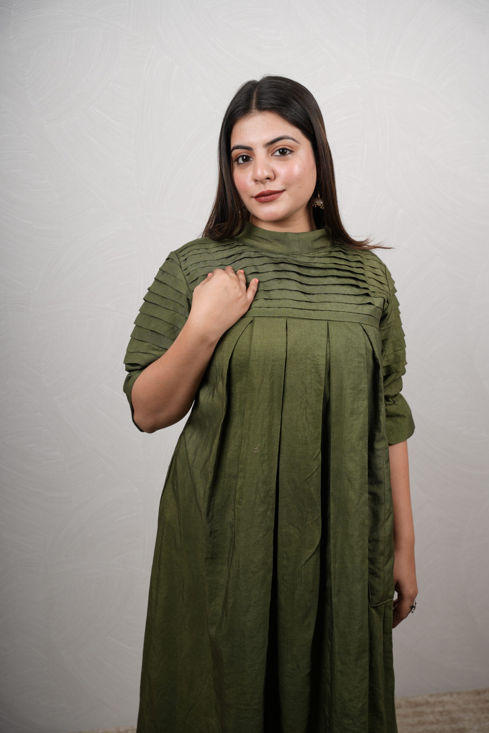 ✨ Timeless Elegance in Olive Green ✨ Experience the perfect blend of comfort and style with our latest Olive Green Maxi. Featuring intricate pintuck detailing, a sophisticated high neck, and a flowy flared silhouette that moves with you—comfortable, elegant, and versatile. size :- S,M,L,&XL