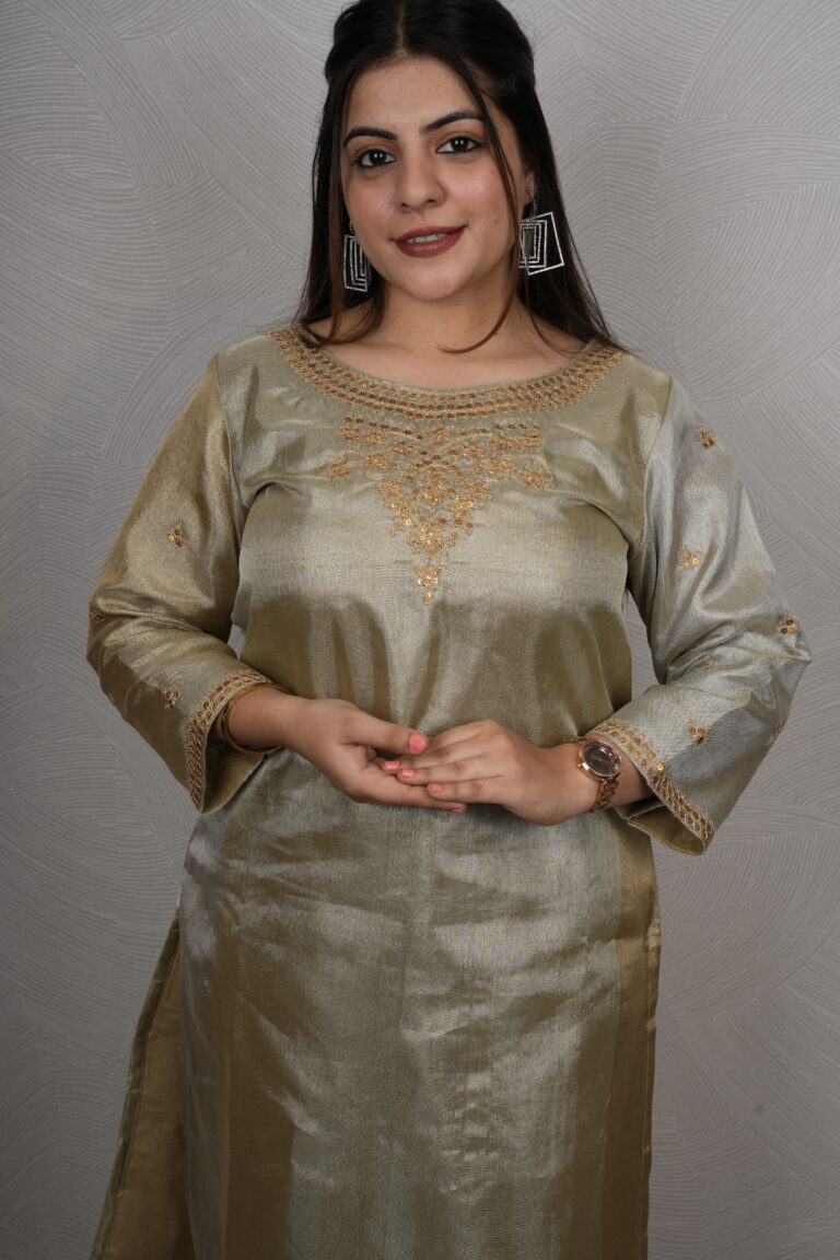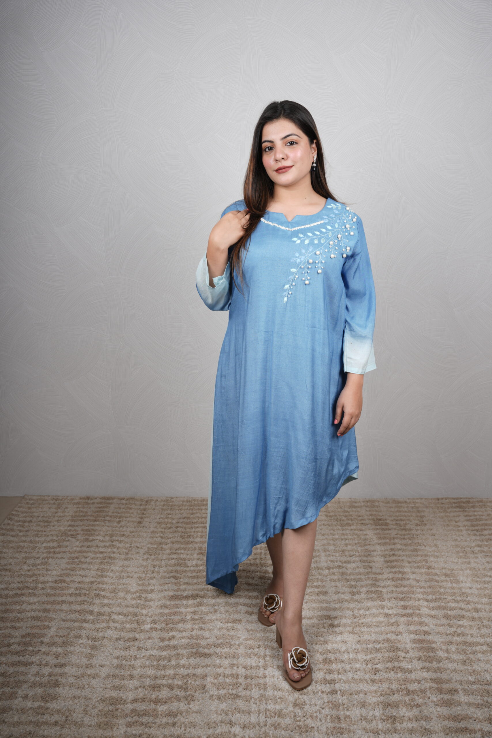 Soft, subtle & effortlessly classy 💙 This beautiful ombré blue kurti features delicate pearl detailing with elegant leaf embroidery and a stylish asymmetrical hemline. Perfect for brunches, small gatherings or a graceful day look.